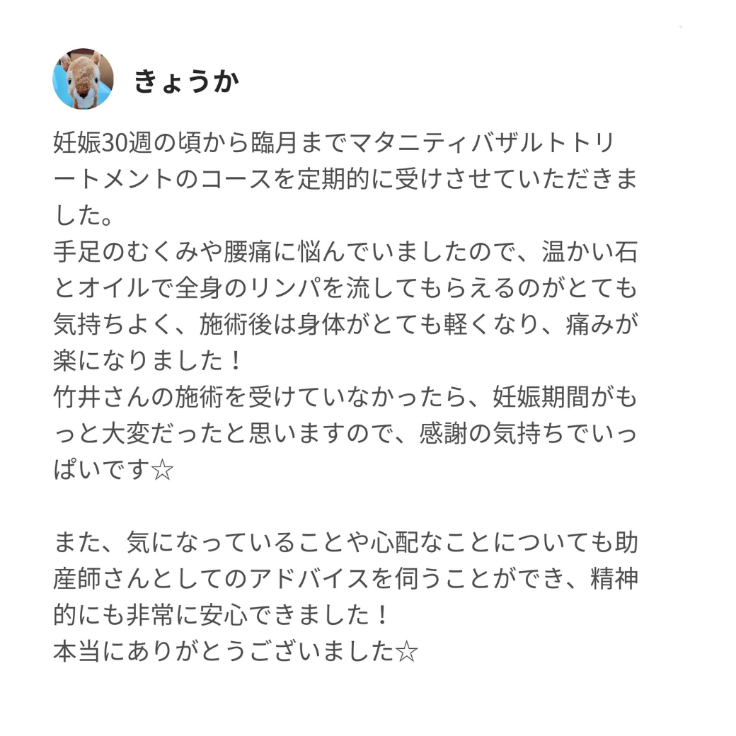 竹井さんの施術を受けていなかったら、妊娠期間がもっと大変だったと思いますので、感謝の気持ちでいっぱいです☆また、気になっていることや心配なことについても助産師さんとしてのアドバイスを伺うことができ、精神的にも非常に安心できました!